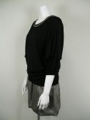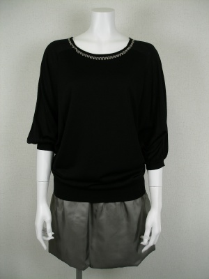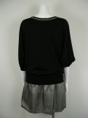 ニットと光沢スカートを組み合わせたワンピース。細いチェーンで刺繍のように見せたネックラインも繊細。