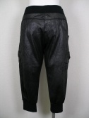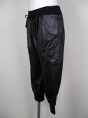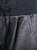 柔らかいレザーのような質感のサルエルパンツ。黒に近いシルバーのような色で、ウエストと裾はリブ素材。