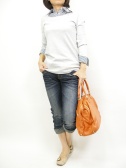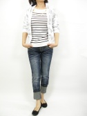 細身のテーパードなので、ロールアップしやすいデニム。裾は伸ばしてクシュクシュさせてもOK。サイズは26〜28で、7号〜11号としました。股下サイズはロールアップを伸ばした状態。ヒップサイズは7号88p、9号92p、11号96p。