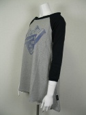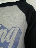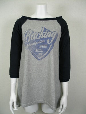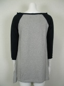 ボートネックでAラインのロゴTシャツ。着ると両端が長くなります。