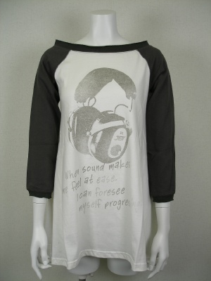 ボートネックでAラインのヘッドフォンプリントTシャツ。着ると両端が長くなります。