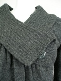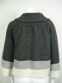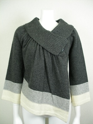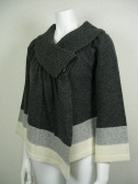 大きな衿とアシンメトリーのデザインが特徴のカーディガンです。白とグレーの配色がかわいい。