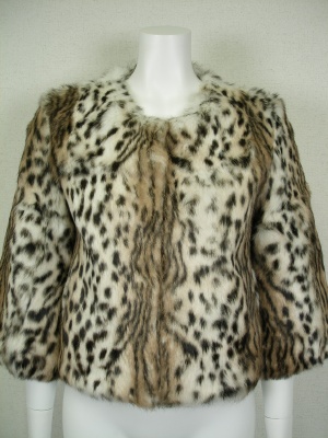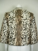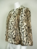 レオパード柄のラビットファージャケット。ノーカラーでフロントはホック留め。よそゆきワンピにもデニムにも合うタイプです。