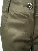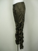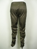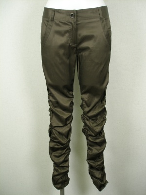 光沢のあるギャザーパンツ。ぴったりフィットするのでブーツインできます。裾をパンプスのかかとに引っ掛けても可愛い。