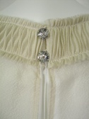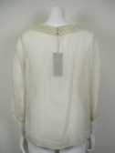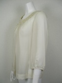 透け感のある上品な素材のブラウス。後ろのキラキラボタンがさりげないポイントです。