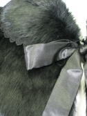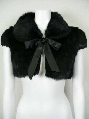 ラビットファーのコンパクトなボレロ。襟と袖には同色のレースを使い、フロントはカギホックとサテンのリボン。裏地とリボンはポリエステル。
