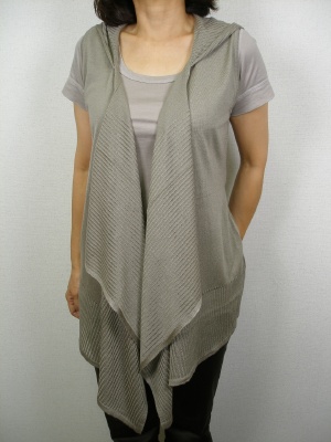薄手ニットのベスト。ドレープがエレガントです。ベルトを後ろで結んでもOK.