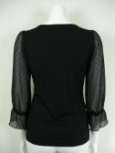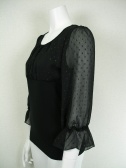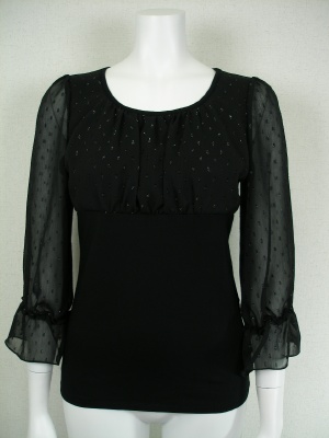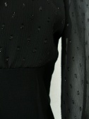 胸元と袖はシフォン地(所々にラメ糸のドット模様でほんのりとキラリ光る生地)を用いて胸元だけは2枚重ね。袖口にはゴムが入って広がる袖に・・