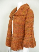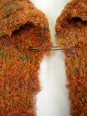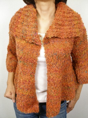 モコモコした質感が可愛いニットカーデ。裾と袖はヒラリと広がっています。付属のピンで閉じますが、前を開けて着てもOK。