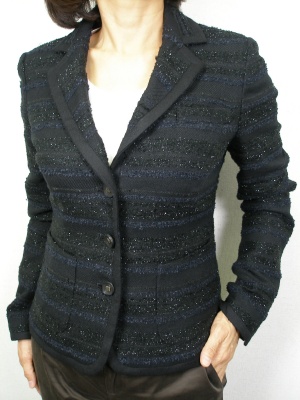 ボーダー部分にラメ入りで同色のパイピング。パッチポケットがレトロかわいいジャケットです。裏地付き。
