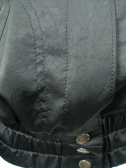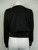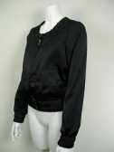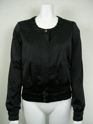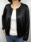 袖口と裾にゴムを入れたブルゾン型ジャケット。光沢素材のジップアップで辛口な印象。