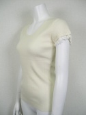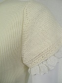 袖口にカギ針編みのフリルをつけたフェミニンなニット。身ごろはリブなので、スカートにインしやすいデザインです。