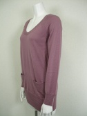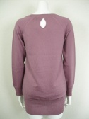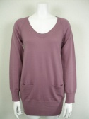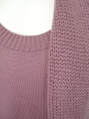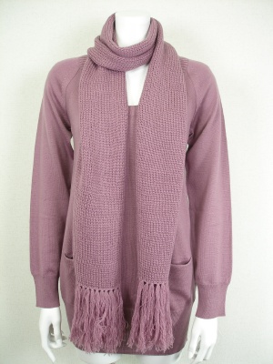 マフラー付きのロングニット。バックの涙開きもポイントです。スモーキーなピンク系パープル。