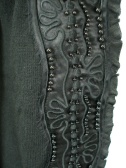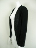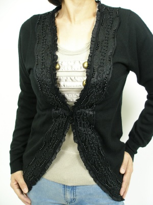 サテン部分にはビーズと刺繍が施されています。ニット素材で裾と袖口はリブ、袖口にはボタンが3つ。フロントはカギホック一つ。