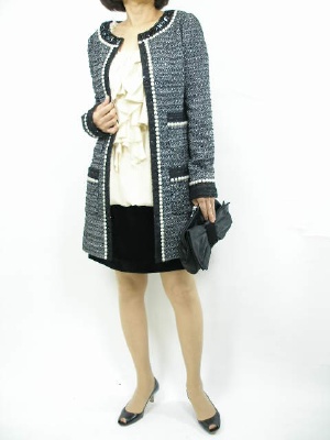 パール風のパーツでトリミング、ネックラインはさらに黒のビジューを。