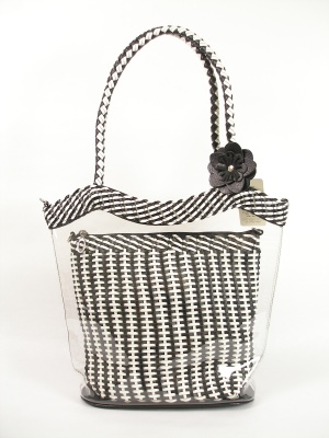 何通りもの使い方ができるビニール×メッシュのバッグ。