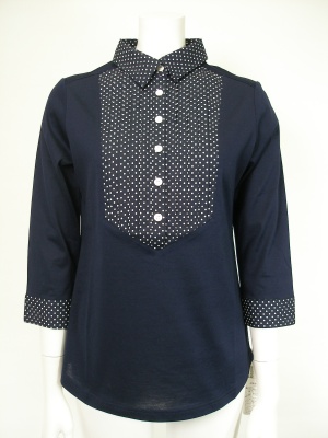 ドットの布帛に切り替え、シャツのように仕上げたカットソー。