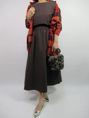 茶系が流行りの今年。少し丈長のお洒落なワンピースはウエストギャザーの甘口です。袖のカフスにコールドのバックルがポイントですね!フェミニン度70%、エレガンス度30%。