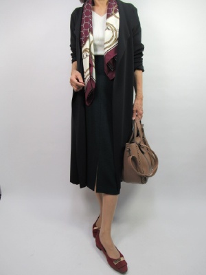 ジャージ素材のタイトスカートをシンプルニットで組み合わせて着流しカーデでコーディネート。上品なシルエットが大人っぽくてお洒落ですね!エレガンス度80%、スタイリッシュ度20%。