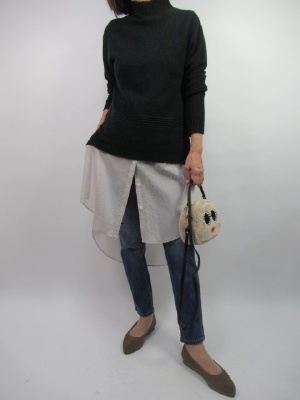 前後差のあるシャツに短丈のハイネックニットでレイヤードに着こなす。今流のロングシャツ合わせデニムに合わせて運動会などアウトドアにピッタリ!アクティブ度100%。