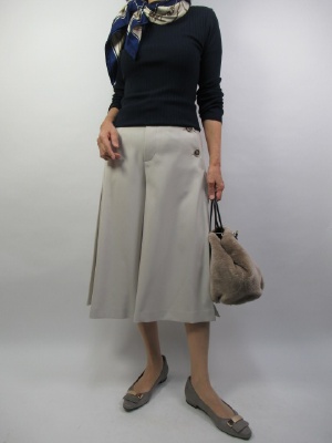グレージュ系のパンツにネイビーのリブニットでベーシックに合わせて柄のスカーフをアクセントに首周りに使うと顔周りが明るく華やかな印象になる!フェミニン度70%、エレガンス度30%。