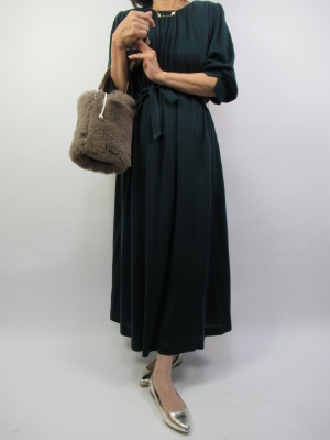 ネックラインからギャザーの分量を多めにとったシルエット。ベルトを絞めることでメリハリのあるコーデになる。袖口もカフスでふんわりさせて全体に甘さのあるワンピース!エレガンス度60%、フェミニン度40%。