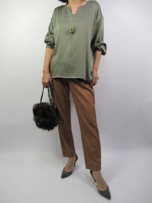 とろみのあるブラウスはキレイ目テーパードパンツが良く似合う。色も今年のキャメル色とカーキのコントラストでモード感のあるコーデ!スタイリッシュ度70%、エレガンス度30%。