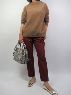 フェレット系の優しいふんわりベージュのニットにはお洒落なカラー、ボルドーが良くマッチする!スタイリッシュ度60%、カジュアル度40%。