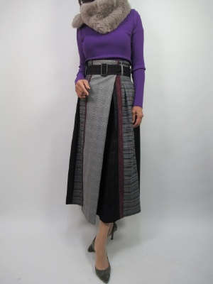 配色に色や柄など織り交ぜたデザインのスカート。ウエストマークしてぺプラムを強調してはくとウエストが引き締められて脚長効果に見える。トップスはシンプルナリブニットがこのスカートにはよく合う!フェミニン度60%、スタイリッシュ度40%。