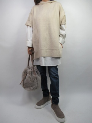 長めのシャツにザックリポンチョを重ねてレイヤードコーデに。フード襟に脇リボンの可愛いポンチョはデニムスタイルに甘さを加えて柔らかな印象になる!アクティブ度90%フェミニン度10%。