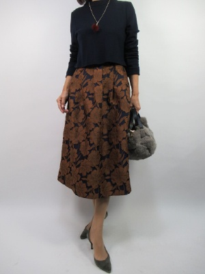 スカート部分は張り感のあるボリュームスカート。大きな花模様でお洒落な一着です。秋のお出かけに一枚できちんと感の出せるワンピースです!エレガンス度80%、フェミニン度20%。