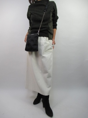 真っ白なタイトスカートはコーデュロイ素材です。カジュアルテーストのお洒落な一枚。トップスも異素材組み合わせのお洒落なデザインをデイリーにコーディネートしてみました!アクティブ度80%、スタイリッシュ度20%。