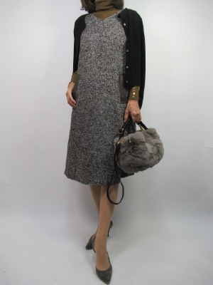 ストンとしたツイードのワンピースを同系色の薄手タートルでシンプルに着こなして。ニットの袖のゴールドのボタンがさりげなくお洒落を演出してくれます!エレガンス度60%、フェミニン度40%。