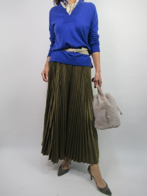 シンプルなVネックのニットは一見するとメンズライクなイメージが強いが柔らかなシルエットのプリーツパンツを合わせると女っぽくしっとりと着こなすことができる!フェミニン度80%、エレガンス度20%。