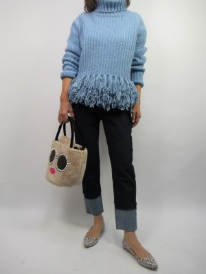 裾にボリュームのあるデザインニットは一枚で完成させたいコーデです。ボトムスはあくまでもシンプルにデニムが一番良く合う。アクティブ度100%。