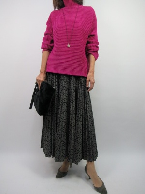 ピンク系の鮮やかな色のニットはザックリシルエットのモール素材。流行りのアニマル柄のボトムスに合わせてお洒落なコーデに仕上げてみました!エレガンス度60%、スタイリッシュ度40%。
