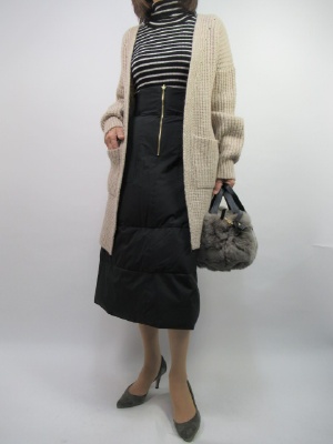 ボリュームのあるAラインダウン入りスカート派フェミニンな印象が強い。黒のトーンにすると甘さが控えめになる。少し長めのカーデをザックリ羽織って!フェミニン度70%、スタイリッシュ度30%。