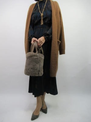 スカートの後ろはプリーツになったお洒落なワンピースはお出かけに最適。一枚で完成するところがワンピースの良いところ。ふんわりした素材のカーデは柔らかなそわいのワンピースにピッタリ!フェミニン度60%、エレガンス度40%。