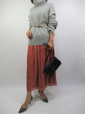 ザックリニット。少し長いデザインなのでスカートの上にオーバーにして着てみました。ウエストにベルトをすることでメリハリのあるスッキリしたコーデになる!スタイリッシュ度70%、カジュアル度30%。