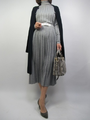 冬から続く流行りのニットワンピースはお出かけ着には一番便利です。太リブ編みのニットにポイントはウエストマークするベルト。同系色のシルバー系でメリハリを付けたコーディネート!エレガンス度70%、フェミニン度30%。
