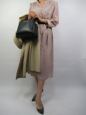 小紋柄の優しいプリント柄ワンピース。柔らかな生地で春らしい一着。まだまだ寒いこの季節はスプリングコートも欠かせないアイテム。今年は薄手のトレンチが流行っていますね!エレガンス度80%、フェミニン度20%。
