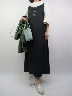 今年多く出ていますジャンパースカート。生地はとろみのある生地ですがあえてカジュアルに着崩してみました。袖ボリュームカットソーで甘さを加えた大人カジュアル!カジュアル度80%、フェミニン度20%