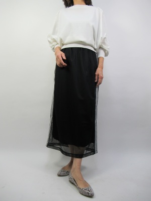 スポーティーテーストのライン入り。スカートもメッシュレースを重ねることでキレイ目のスポーティーラインになる。トップスもお揃いのトレーナータイプ。デイリーでも使える休日ファッション!アクティブ度80%、スタイリッシュ度20%。