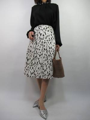 シンプルなブラウスとベーシックなデザインのスカートを合わせるだけできちんと感のあるお洒落着に。春のお呼ばれにピッタリ!エレガンス度60%、フェミニン度40%。