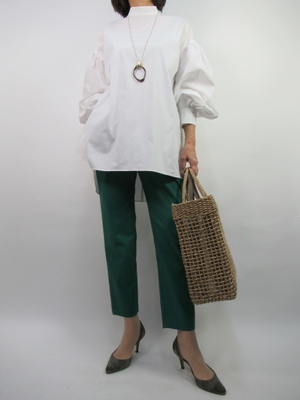白に鮮やかなグリーンのパンツを合わせて春らしくコーデしてみました。袖はたくし上げて、よりボリュームをつけると今年っぽいコーデになります!スタイリッシュ度80%、アクティブ度20%。
