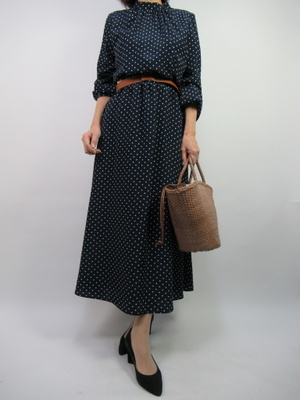 小さなドット柄なのでワンピースの分量の割にすっきりと上品に着こなせるワンピース。柔らかい素材なので歩くたびに揺れるシルエットがおしゃれなお出かけワンピース!エレガンス度70%、フェミニン度30%。