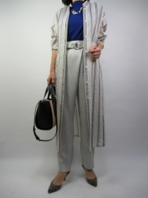 パンツスタイルにさっと羽織れるシャツワンピースはこの時期とても重宝です。ストライプ柄なので中に無地を合わせてメリハリのあるコーデが楽しめます!スタイリッシュ度80%、エレガンス度20%。