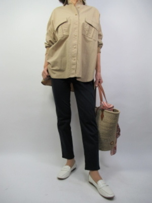 お尻まで隠してくれるビッグシルエットシャツは袖口がリブになっているのでたくし上げて着こなしても袖が落ちてこない。そして体のラインも上手に隠してくれる。シャツコーデのデイリーファッションにはピッタリ!アクティブ度80%、スタイリッシュ度20%。