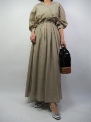 スカート部分に分量を持たせたマキシ丈タイプのワンピース。ウエストはゴムと紐も調節になっていますので、ちゃんとウエストラインが作れて着ていて楽な一枚です。胸元はカシュクールですっきり見せてくれるところがポイントです!エレガンス度70%、フェミニン度30%。