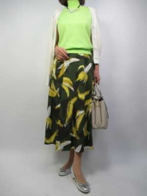 大きなプリント柄が目を引く春コーデ。スカートのグリーンに合わせてトップスは明るめのグリーンのニットをチョイス!フェミニン度70%、エレガンス度30%。
